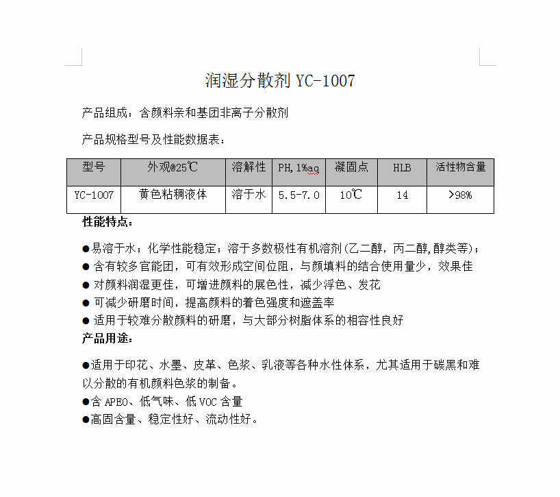 經(jīng)濟型水性有機顏料炭黑色漿分散劑YC-1007